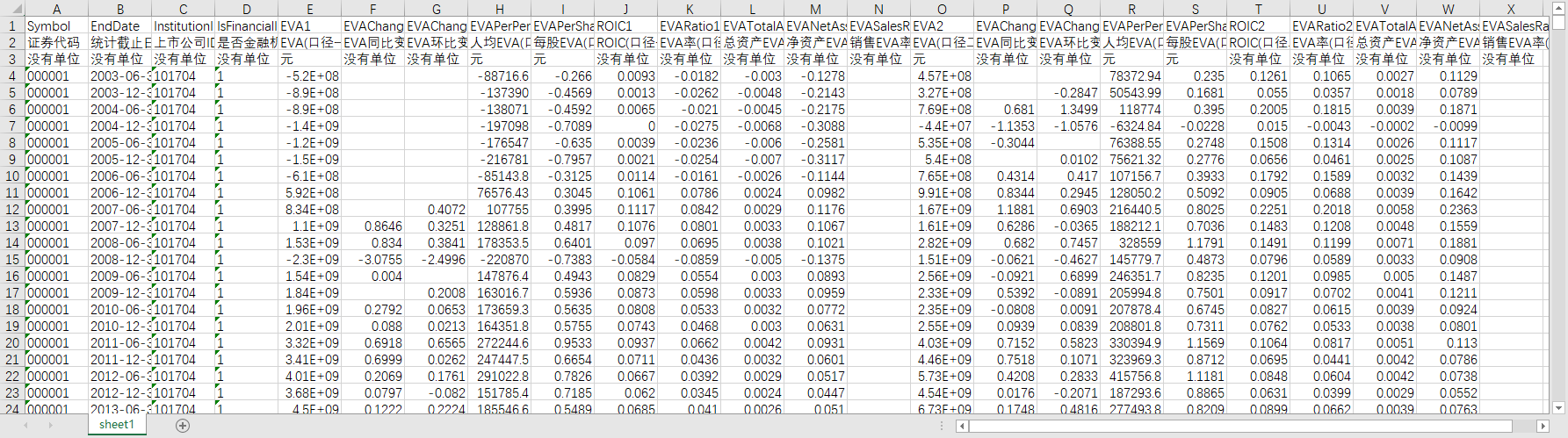 证券代码 统计截止日期 上市公司ID 是否金融机构 EVA(口径一) EVA同比变动比例(口径一) EVA环比变动比例(口径一) 人均EVA(口径一) 每股EVA(口径一) ROIC(口径一) EVA率(口径一) 总资产EVA率(口径一) 净资产EVA率(口径一) 销售EVA率(口径一) EVA(口径二) EVA同比变动比例(口径二) EVA环比变动比例(口径二) 人均EVA(口径二) 每股EVA(口径二) ROIC(口径二) EVA率(口径二) 总资产EVA率(口径二) 净资产EVA率(口径二) 销售EVA率(口径二)