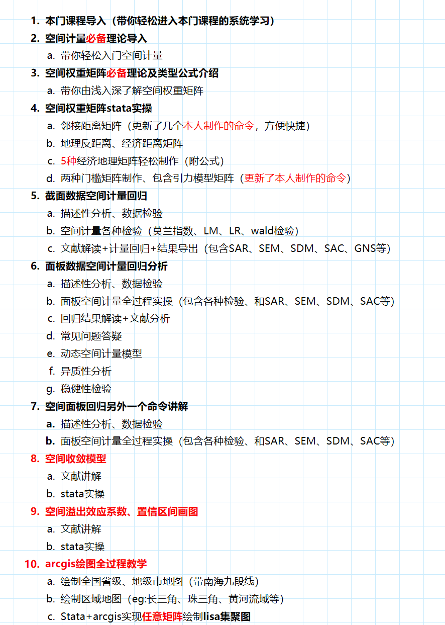此次课程力求新颖,添加了很多新东西,基本能够满足写论文的全套需求了。既适合小白学习,也适合有一定空间计量基础的朋友学习。