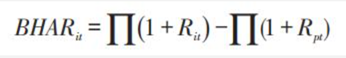 长期并购绩效以购买并持有超常收益(BHAR)和总资产收益变化值(ΔROA)变量进行测量。关于购买并持有超常收益(BHAR),测量为购买公司股票并-持有到并购后两年(24个月),公司股票收益率超过市场组合或对应组合收益率的部分。本文计算并购公司i并购后[0.t]月BHAR的公式为: