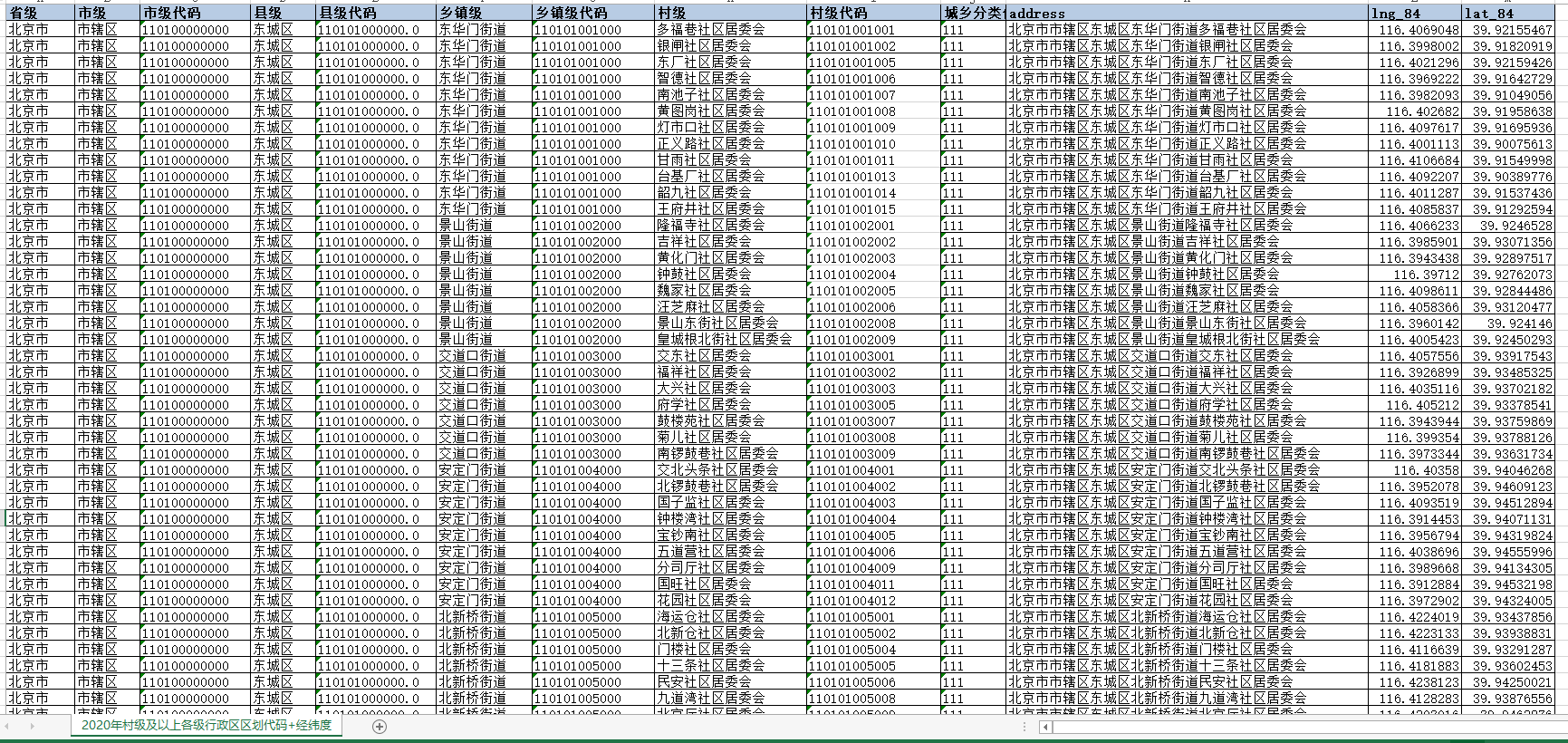 2020年村级及以上各级行政区区划代码+经纬度(含市\县\乡镇\村级)