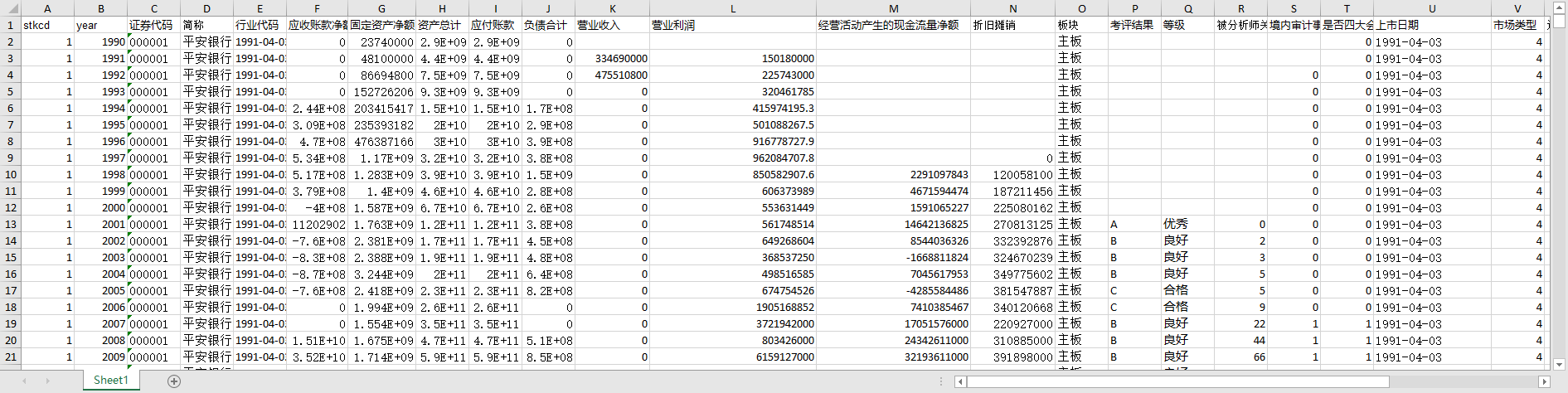 stkcd year 证券代码 简称 行业代码 应收账款净额 固定资产净额 资产总计 应付账款 负债合计 营业收入 营业利润 经营活动产生的现金流量净额 折旧摊销 板块 考评结果 等级 被分析师关注度 境内审计事务所 是否四大会计事务所 上市日期 市场类型 退市日期 退市日期2