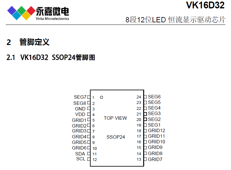 VK16D32是一种恒流数码管或点阵LED驱动控制专用芯片,内部集成有数据锁存器、LED 恒流驱动模块等电路。可以通过寄存器配置,调节扫描的位数,从而获得更大的单点驱动电 流。数据通过I2C通讯接口与MCU通信。SEG脚接LED阳极,GRID脚接LED阴极,可支持 8SEGx1GRID到8SEGx12GRID的点阵LED显示面板。采用SSOP24的封装形式,适用于小型LED 显示屏驱动。