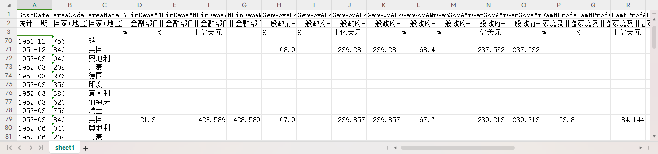 统计日期 国家(地区)代码 国家(地区)名称 非金融部门-所有部门-市场价值-占GDP比重-季调 非金融部门-所有部门-市场价值-占GDP比重(使用PPP汇率)-季调 非金融部门-所有部门-市场价值-按美元-季调 非金融部门-所有部门-市场价值-本币-季调 一般政府-所有部门-票面价值-占GDP比重-季调 一般政府-所有部门-票面价值-占GDP比重(使用PPP汇率)-季调 一般政府-所有部门-票面价值-按美元-季调 一般政府-所有部门-票面价值-本币-季调 一般政府-所有部门-市场价值-占GDP比重-季调 一般政府-所有部门-市场价值-占GDP比重(使用PPP汇率)-季调 一般政府-所有部门-市场价值-按美元-季调 一般政府-所有部门-市场价值-本币-季调 家庭及非盈利性机构-所有部门-市场价值-占GDP比重-季调 家庭及非盈利性机构-所有部门-市场价值-占GDP比重(使用PPP汇率)-季调 家庭及非盈利性机构-所有部门-市场价值-按美元-季调 家庭及非盈利性机构-所有部门-市场价值-本币-季调 家庭及非盈利性机构-所有部门-市场价值-本币-非季调 非金融公司-所有部门-市场价值-占GDP比重-季调 非金融公司-所有部门-市场价值-占GDP比重(使用PPP汇率)-季调 非金融公司-所有部门-市场价值-按美元-季调 非金融公司-所有部门-市场价值-本币-季调 非金融公司-所有部门-市场价值-本币-非季调 私营非金融部门-所有部门-市场价值-占GDP比重-季调 私营非金融部门-所有部门-市场价值-占GDP比重(使用PPP汇率)-季调 私营非金融部门-所有部门-市场价值-按美元-季调 私营非金融部门-所有部门-市场价值-本币-季调 私营非金融部门-所有部门-市场价值-本币-非季调 私营非金融部门-银行-市场价值-占GDP比重-季调 私营非金融部门-银行-市场价值-占GDP比重(使用PPP汇率)-季调 私营非金融部门-银行-市场价值-按美元-季调 私营非金融部门-银行-市场价值-本币-季调 私营非金融部门-银行-市场价值-本币-非季调 本币单位