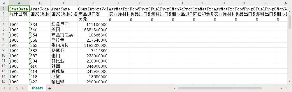 统计日期 国家(地区)代码 国家(地区)名称 商品进口额 农业原材料进口额占商品进口额的比例 食品进口额占商品进口额的比例 燃料进口额占商品进口额的比例 制成品进口额占商品进口额的比例 矿石和金属进口额占商品进口额的比例 农业原材料出口额占商品出口额的比例 食品出口额占商品出口额的比例 燃料出口额占商品出口额的比例 制成品出口额占商品出口额的比例 矿石和金属出口额占商品出口额的比例
