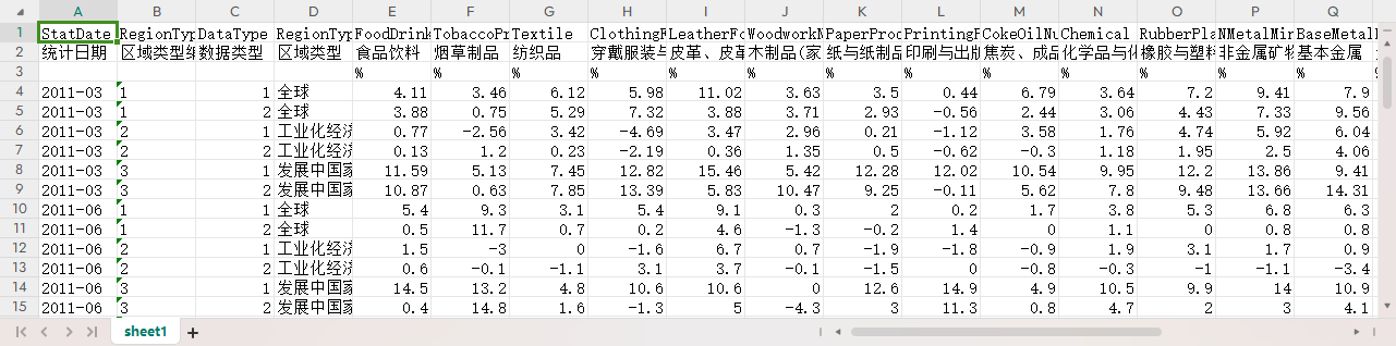 统计日期        区域类型编码        数据类型        区域类型        食品饮料        烟草制品        纺织品        穿戴服装与毛皮        皮革、皮革制品与鞋类        木制品(家具除外)        纸与纸制品        印刷与出版制品        焦炭、成品油与核燃料        化学品与化学制品        橡胶与塑料制品        非金属矿物制品        基本金属        金属制品        机械与设备        办公、会计与计算用机械        电气机械与设备        广播、电视与通信设备        医疗、精密与光学仪器        机动车、拖车与半挂车        其它运输设备        家具与制造