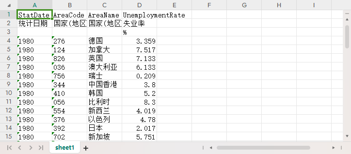 统计日期 国家(地区)代码 国家(地区)名称 失业率