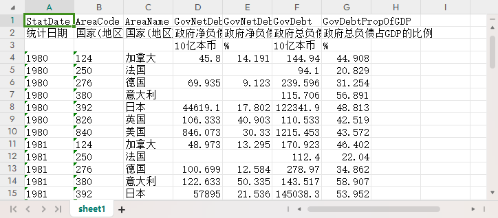 统计日期 国家(地区)代码 国家(地区)名称 ZF净负债 ZF净负债占GDP的比例 ZF总负债 ZF总负债占GDP的比例
