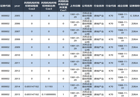 | 证券代码 | year | 共同机构所有权联结程度Coz2 | 共同机构所有权持股比例Coz3