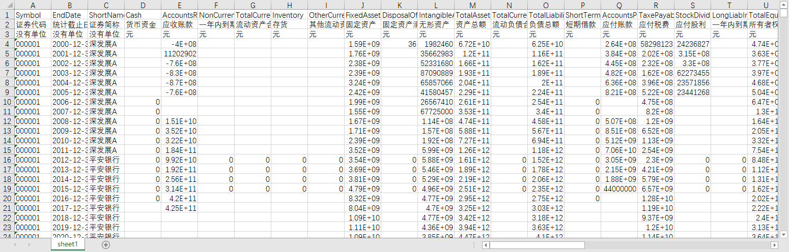 证券代码 统计截止日期 证券简称 货币资金 应收账款 一年内到期的非流动资产 流动资产合计 存货 其他流动资产 固定资产 固定资产清理 无形资产 资产总额 流动负债合计 负债总额 短期借款 应付账款 应付税费 应付股利 一年内到期的长期负债 所有者权益合计 股本 营业总收入 营业收入 营业总成本 营业成本 营业税金及附加 销售费用 管理费用 研发费用 财务费用 营业利润 营业外收入 营业外支出 利润总额 所得税费用 净利润 固定资产折旧、油气资产折耗、生产性生物资产折旧 无形资产摊销 长期待摊费用摊销 经营活动产生的现金流量净额 资产负债率 总资产报酬率A 总资产报酬率B 总资产报酬率C 总资产净利润率A 总资产净利润率B 总资产净利润率C 净资产收益率(ROE)A 净资产收益率(ROE)B 净资产收益率(ROE)C 市值A 市值B 账面市值比A 账面市值比B 每股收益 每股净资产 行业代码 行业名称