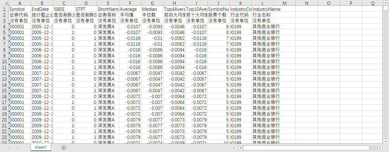 SymbolNum [股票个数] - 同年度同行业内参与对比的其他股票数量,制造业“C”字头代码取2位,其他行业取1位,进行行业分类。