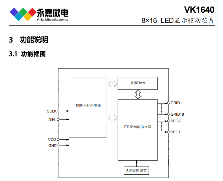 VK1640A 3.0~5.5V 驱动点阵:128 共阴驱动:8段16位 共阳驱动:16段8位 通讯接口:CLK/DIN