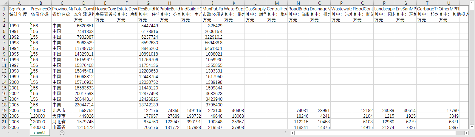 统计年度 省份代码 省份名称 本年建设投入合计 房屋建设投入小计 其中:房地产开发投入 其中:住宅建设投入 其中:公共建筑建设投入 其中:生产性建筑建设投入 市政公用设施建设投入小计 其中:供水建设投入 其中:燃气建设投入 其中:集中供热建设投入 其中:道路桥梁建设投入 其中:排水建设投入 其中:污水处理建设投入 其中:防洪建设投入 其中:园林绿化建设投入 其中:环境卫生建设投入 其中:垃圾处理建设投入 其中:其他投入
