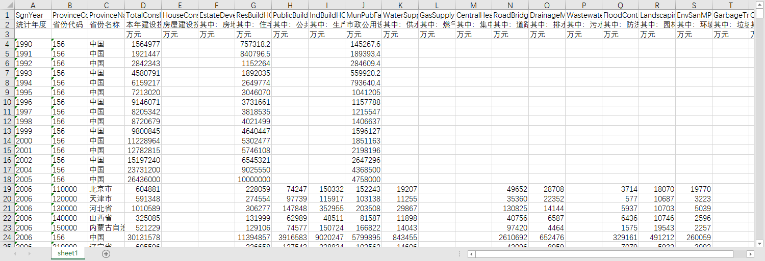 统计年度 省份代码 省份名称 本年建设投入合计 房屋建设投入小计 其中:房地产开发投入 其中:住宅建设投入 其中:公共建筑建设投入 其中:生产性建筑建设投入 市政公用设施建设投入小计 其中:供水建设投入 其中:燃气建设投入 其中:集中供热建设投入 其中:道路桥梁建设投入 其中:排水建设投入 其中:污水处理建设投入 其中:防洪建设投入 其中:园林绿化建设投入 其中:环境卫生建设投入 其中:垃圾处理建设投入 其中:其他投入