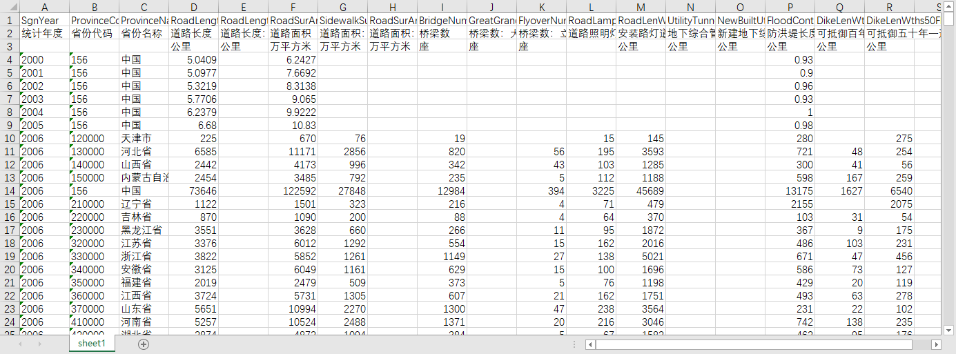 统计年度 省份代码 省份名称 道路长度 道路长度:建成区 道路面积 道路面积:人行道面积 道路面积:建成区 桥梁数 桥梁数:大桥及特大桥 桥梁数:立交桥 道路照明灯盏数 安装路灯道路长度 地下综合管廊长度 新建地下综合管廊长度 防洪堤长度 可抵御百年一遇洪水的防洪堤长度 可抵御五十年一遇洪水的防洪堤长度
