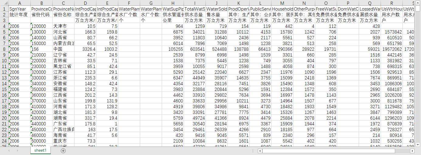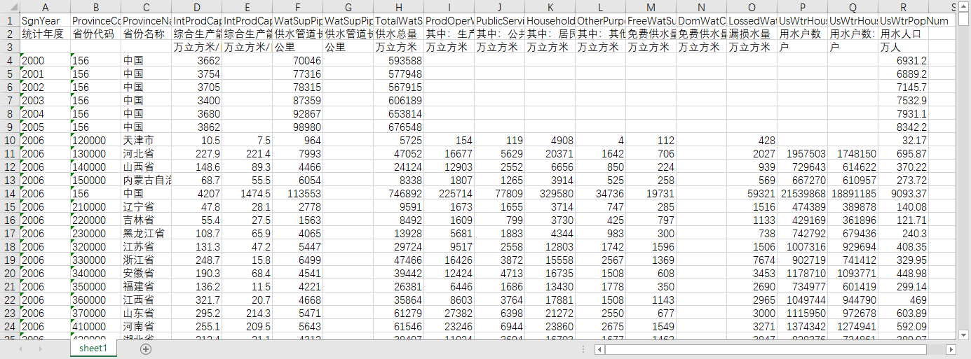 统计年度 省份代码 省份名称 综合生产能力 综合生产能力:地下水 水厂个数 水厂个数:地下水 供水管道长度 供水总量 售水量 其中:生产运营用水 其中:公共服务用水 其中:居民家庭用水 其中:其他用水 免费供水量 免费供水量:生活用水 漏损水量 用水户数 用水户数:家庭用户 用水人口