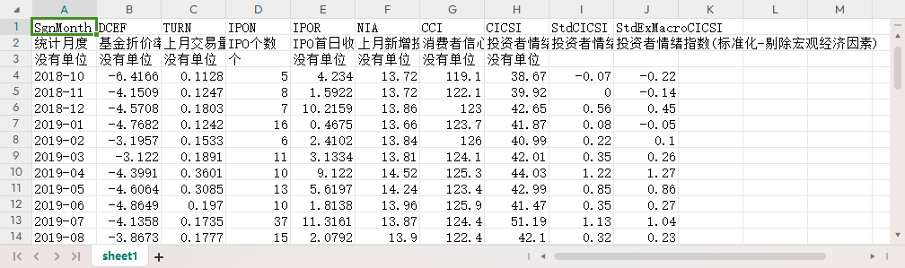 统计月度 基金折价率(%) 上月交易量 IPO个数 IPO首日收益 上月新增投资者开户数 消费者信心指数 投资者情绪指数 投资者情绪指数(标准化) 投资者情绪指数(标准化-剔除宏观经济因素)