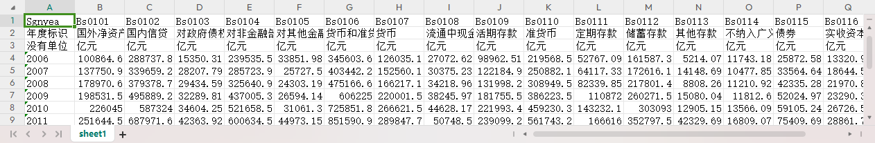 年度标识 国外净资产 国内信贷 对ZF债权(净) 对非金融部门债权 对其他金融部门债权 货币和准货币 货币 流通中现金 活期存款 准货币 定期存款 储蓄存款 其他存款 不纳入广义货币的存款 债券 实收资本 其他(净)