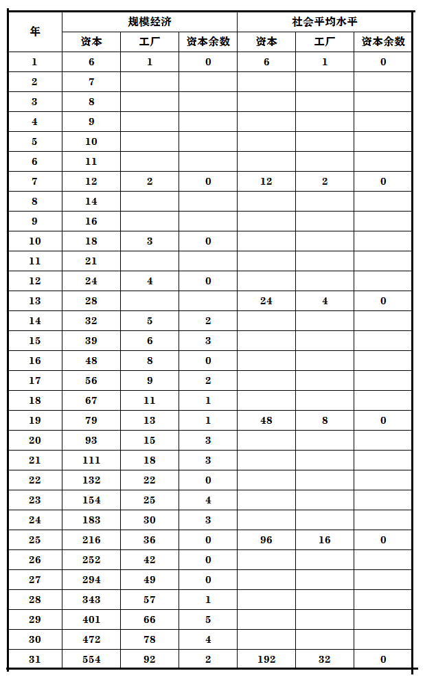 以第19年为例:当年总资本为79,共有13座工厂,有1的闲置资本。到了第20年,当年的总资本为79+13+1=93,其中13为每年创造的利润。两种模式下,初始资本都是6,有工厂1座。到了第31年的年初,规模经济可以形成92座工厂,远高于社会平均水平的32座工厂。这说明30年中,规模经济创造的利润几乎是社会平均水平的3倍。
