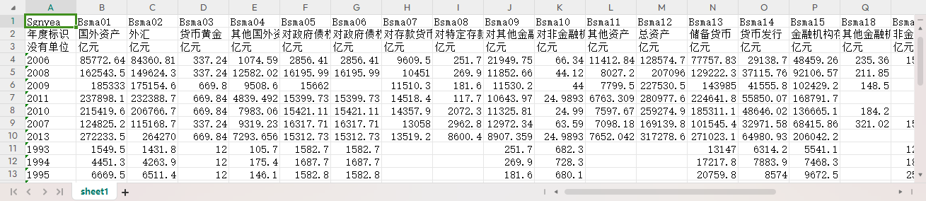 年度标识 国外资产 外汇 货币黄金 其他国外资产 对ZF债权 对ZF债权-中央ZF 对其他存款性公司债权 对其他金融性公司债权 对非金融部门债权 其他资产 总资产 储备货币 货币发行 金融性公司存款 其他存款性公司 其他金融性公司 非金融性公司存款 活期存款 发行债券 国外负债 ZF存款 自有资金 其他负债 总负债 不计入储备货币的金融性公司存款