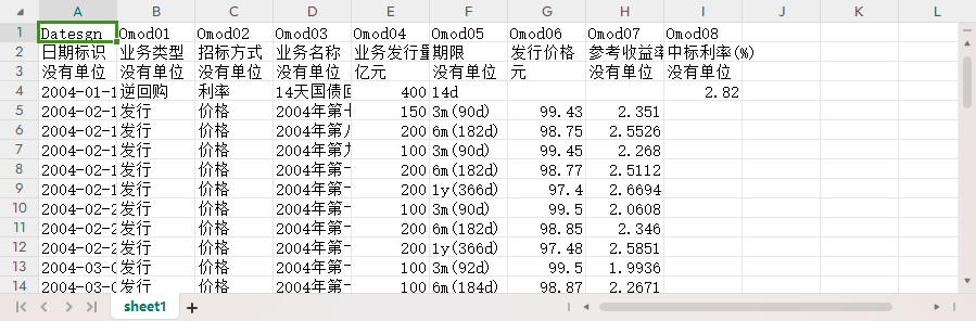 日期标识 业务类型 招标方式 业务名称 业务发行量/交易量 期限 发行价格 参考收益率(%) 中标利率(%)