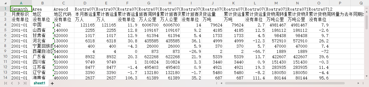 月度标识 地区 地区代码 本月客运量 累计客运量 累计客运量为去年同期比(%) 旅客周转量 累计旅客周转量 累计旅客周转量为去年同期比(%) 货运量 累计货运量 累计货运量为去年同期比(%) 货物周转量 累计货物周转量 累计货物周转量为去年同期比(%)