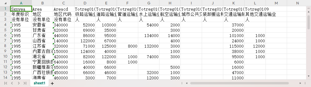 年度标识 地区 地区代码 铁路运输业 道路运输业 管道运输业 水上运输业 航空运输业 城市公共交通业 装卸搬运和其他运输服务业 交通运输辅助业 其他交通运输业