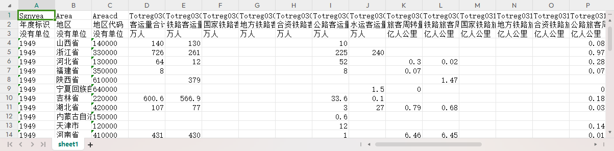 年度标识 地区 地区代码 客运量合计 铁路客运量 国家铁路客运量 地方铁路客运量 合资铁路客运量 公路客运量 水运客运量 旅客周转量合计 铁路旅客周转量 国家铁路旅客周转量 地方铁路旅客周转量 合资铁路旅客周转量 公路旅客周转量 水运旅客周转量 货运量合计 铁路货运量 国家铁路货运量 地方铁路货运量 合资铁路货运量 公路货运量 水运货运量 货物周转量合计 铁路货物周转量 国家铁路货物周转量 地方铁路货物周转量 合资铁路货物周转量 公路货物周转量 水运货物周转量