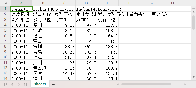 月度标识 港口名称 集装箱吞吐量 累计集装箱吞吐量 累计集装箱吞吐量为去年同期比(%)