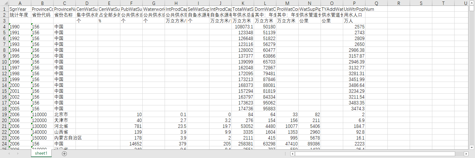 统计年度 省份代码 省份名称 集中供水的乡个数 占全部乡的比例 公共供水设施个数 公共供水设施个数其中:水厂 公共供水综合生产能力 自备水源单位个数 自备水源单位综合生产能力 年供水总量 其中:年生活用水量 其中:年生产用水量 供水管道长度 供水管道长度:本年新增供水管道长度 用水人口