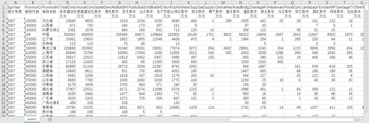 统计年度 省份代码 省份名称 本年建设投入合计 房屋建设投入小计 其中:房地产开发投入 其中:住宅建设投入 其中:公共建筑建设投入 其中:生产性建筑建设投入 市政公用设施建设投入小计 其中:供水建设投入 其中:燃气建设投入 其中:集中供热建设投入 其中:道路桥梁建设投入 其中:排水建设投入 其中:污水处理建设投入 其中:防洪建设投入 其中:园林绿化建设投入 其中:环境卫生建设投入 其中:垃圾处理建设投入 其中:其他投入
