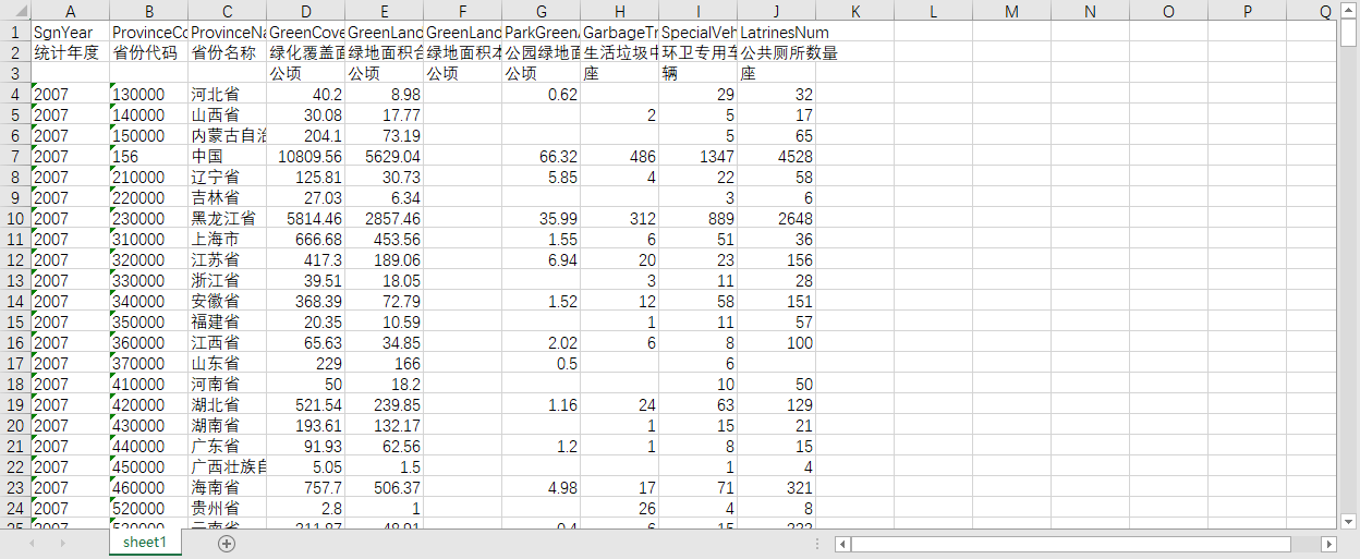 统计年度 省份代码 省份名称 绿化覆盖面积 绿地面积合计 绿地面积本年新增 公园绿地面积 生活垃圾中转站 环卫专用车辆设备数 公共厕所数量