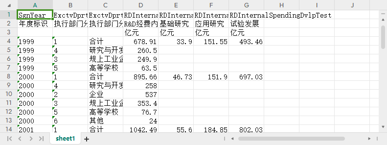 年度标识 执行部门分类编码 执行部门分类名称 R&D经费内部支出 基础研究 应用研究 试验发展