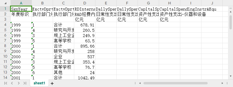 年度标识 执行部门分类编码 执行部门分类名称 R&D经费内部支出 日常性支出 日常性支出-人员劳务费 资产性支出 资产性支出-仪器和设备