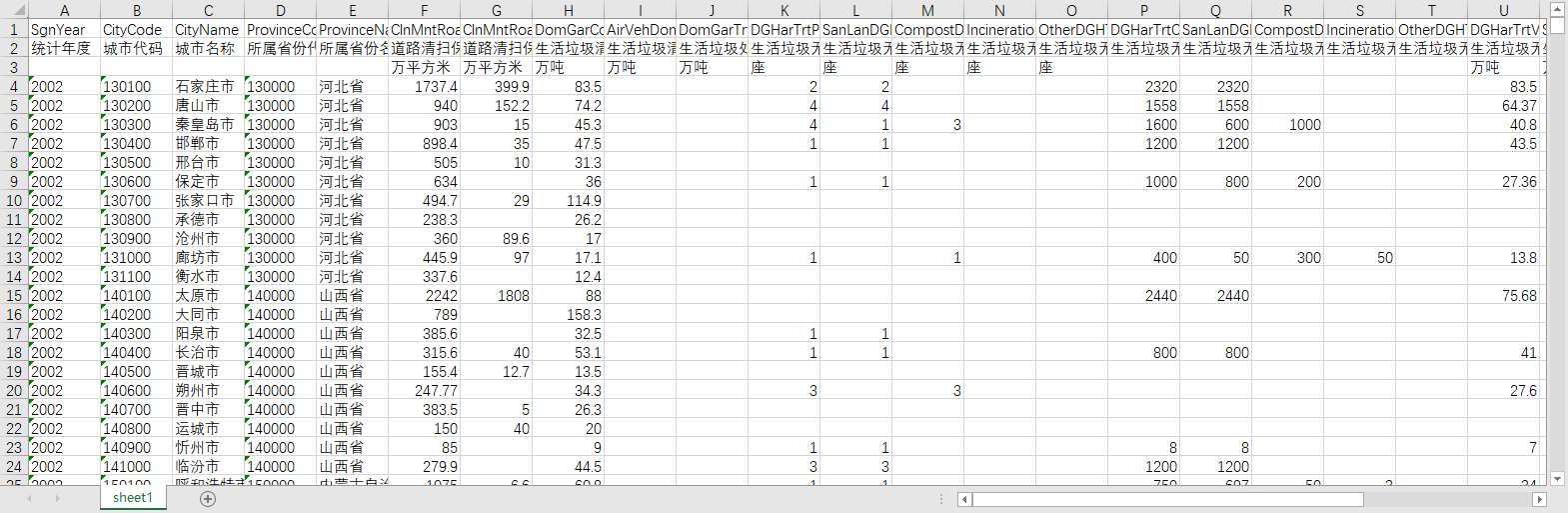 统计年度 城市代码 城市名称 所属省份代码 所属省份名称 道路清扫保洁面积 道路清扫保洁面积:机械化 生活垃圾清运量 生活垃圾清运量:密闭车(箱)清运量 生活垃圾处理量 生活垃圾无害化处理厂数 生活垃圾无害化处理厂数:卫生填埋 生活垃圾无害化处理厂数:堆肥厂 生活垃圾无害化处理厂数:焚烧 生活垃圾无害化处理厂数:其他 生活垃圾无害化处理能力 生活垃圾无害化处理能力:卫生填埋 生活垃圾无害化处理能力:堆肥厂 生活垃圾无害化处理能力:焚烧 生活垃圾无害化处理能力:其他 生活垃圾无害化处理量 生活垃圾无害化处理量:卫生填埋 生活垃圾无害化处理量:堆肥厂处理量 生活垃圾无害化处理量:焚烧 生活垃圾无害化处理量:其他 粪便清运量 粪便处理量 公共厕所数 公共厕所数:三类以上 市容环卫专用车辆设备总数