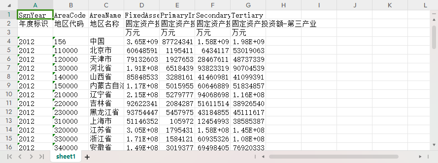 年度标识 地区代码 地区名称 固定资产投资额 固定资产投资额-第一产业 固定资产投资额-第二产业 固定资产投资额-第三产业
