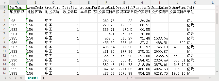 年度标识 地区代码 地区名称 数据标识 本年投资实际到位资金小计 投资实际到位资金-国家预算资金 投资实际到位资金-国内贷款 投资实际到位资金-利用外资 投资实际到位资金-自筹资金 投资实际到位资金-其他资金 单位