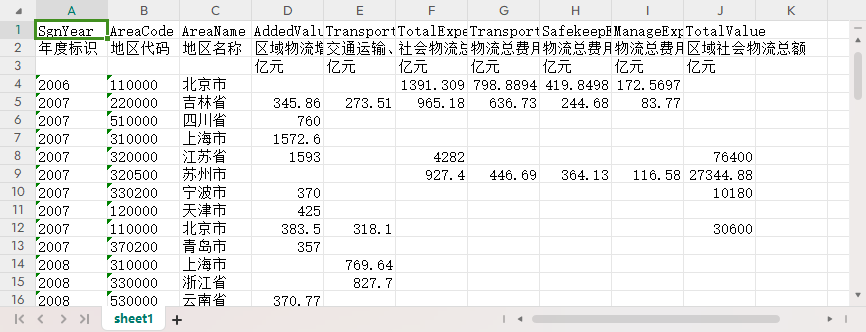 年度标识 地区代码 地区名称 区域物流增加值 交通运输、邮政、仓储业增加值 社会物流总费用 物流总费用-运输费用 物流总费用-保管费用 物流总费用-管理费用 区域社会物流总额