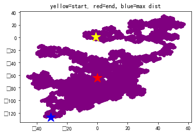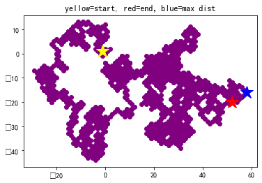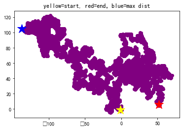 plt.title('yellow=start, red=end,blue=max dist')
