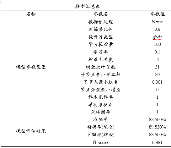 模型汇总表展示模型各项参数设置情况,最后SPSSAU输出使用python中slearn包构建本次LightGBM模型的核心代码如下: