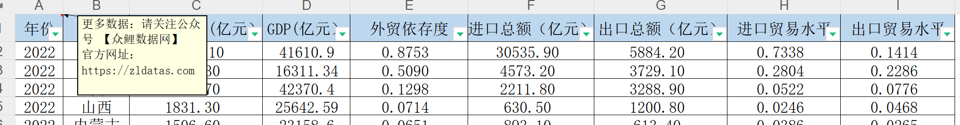 年份、省份、进出口总额(亿元)、GDP(亿元)、外贸依存度、进口总额(亿元)、出口总额(亿元)、进口贸易水平、出口贸易水平。