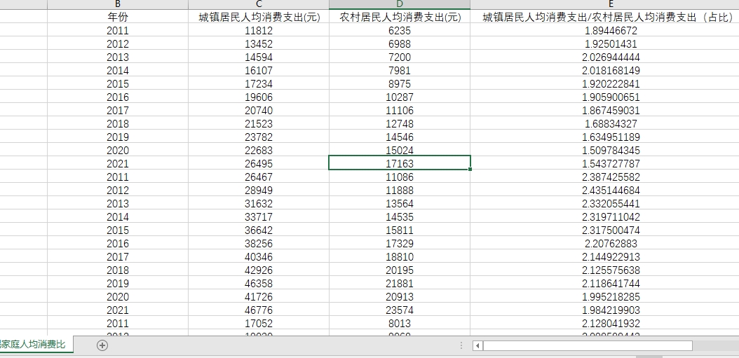 4、数据指标:城镇居民人均消费支出、农村居民人均消费支出、城镇居民人均消费支出/农村居民人均消费支出。