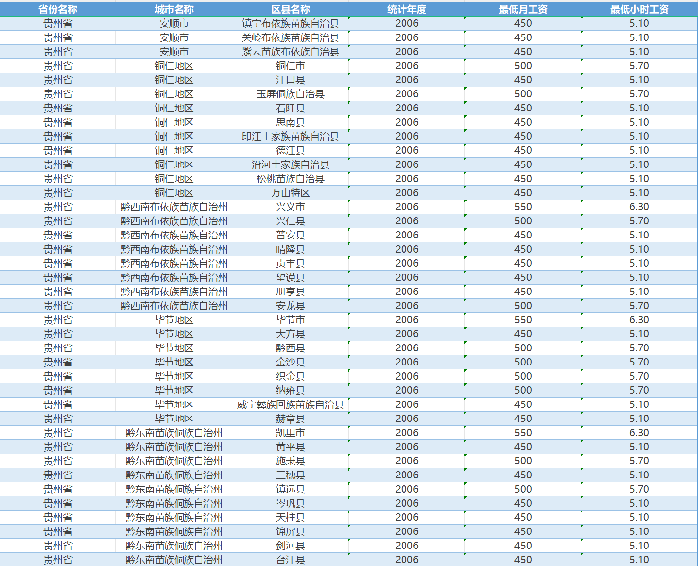 全国各省份地市州地级市区县最低工资标准数据2001-2023最低月工资最低小时工资