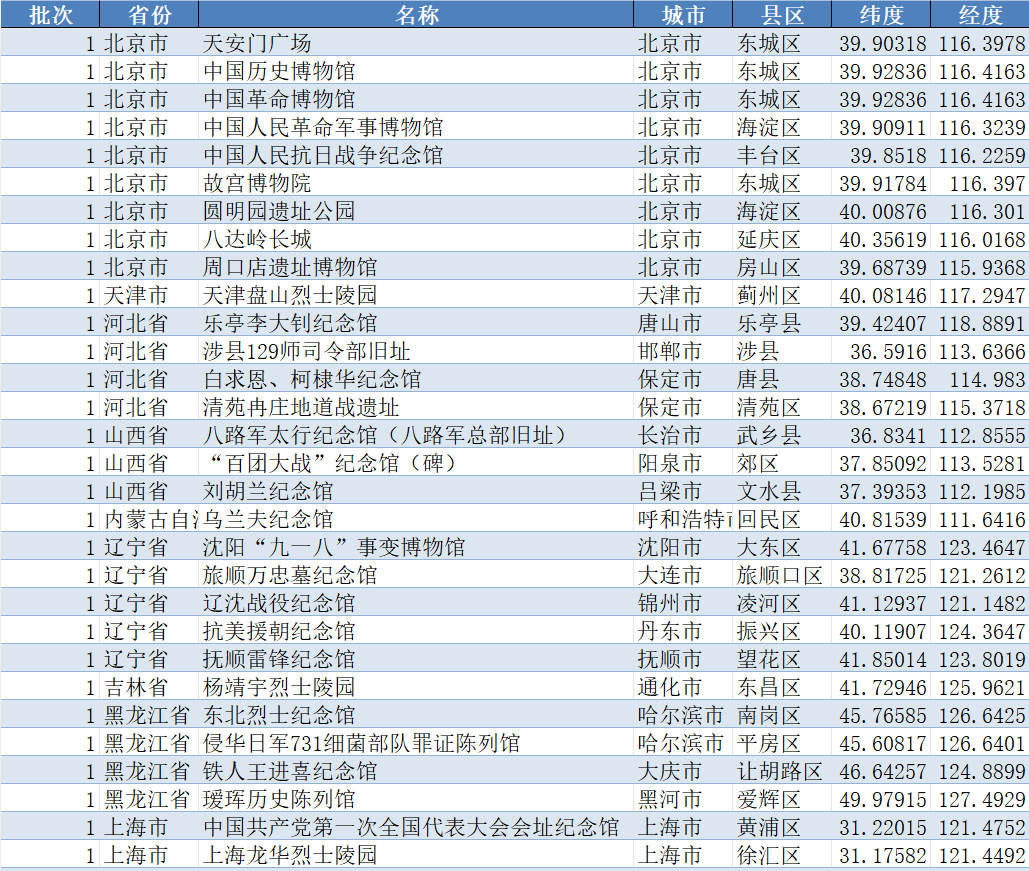 红色文化全国各省份地市州地级市区县爱国主义教育示范基地数据城市县区经纬度.zip
