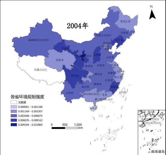 本文使用我国行政区划地图对数据进行了可视化处理。下图为我国2004年与2022年各省环境规制强度的可视化图示例: