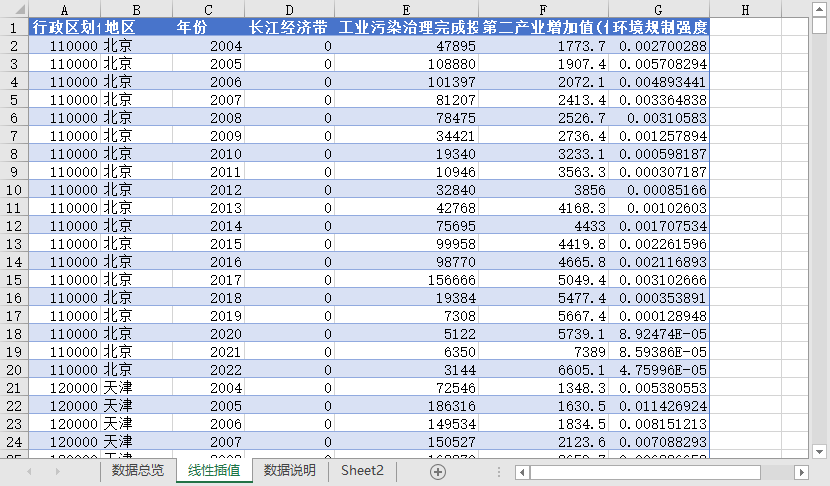 行政区划代码 地区 年份 长江经济带 工业污染治理完成投资(万元) 第二产业增加值(亿元) 环境规制强度