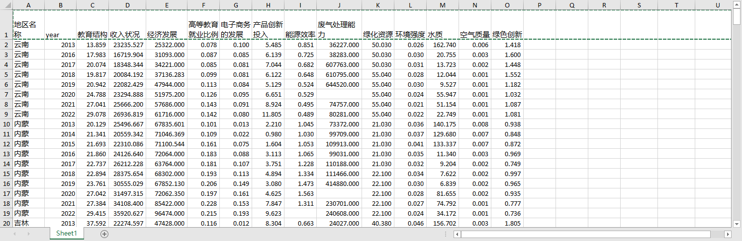 地区名称 year 教育结构 收入状况 经济发展 高等教育就业比例 电子商务的发展 产品创新投入 能源效率 废气处理能力 绿化资源 环境强度 水质 空气质量 绿色创新