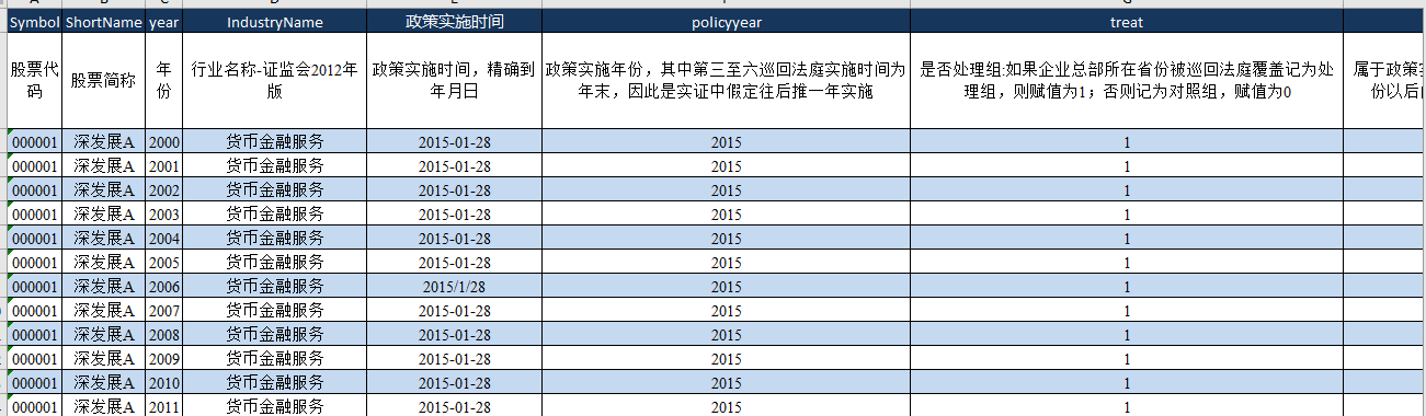 | 股票代码、股票简称、年份 | 行业名称-证监会2012年版 | 政策实施时间,精确到年月日 | 当年是否ST或PT |
