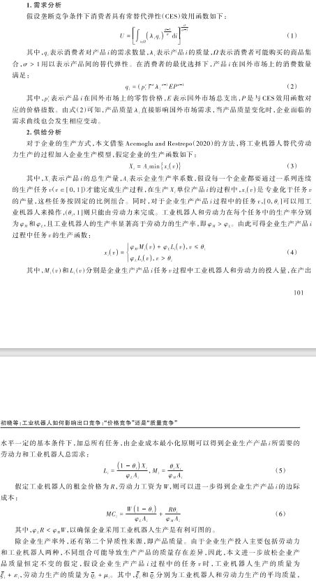 工业机器人技术的快速发展及其在生产领城中的广泛应用动全球贸易分工格局演变。厘清工业机器人影响出口的竞争机制,对于一国在日益激烈的国际竞争中占据主动至关重要。与以往文献主要关注机器人在供给侧的影响不同,本文同时在供给侧与需求侧两端考察出口竞争机制。实证分析表明,工业机器人通过“价格竞争”和“质量竞争"共同促进企业出口,但“价格竞争"占主导地位,这一结论在进行工具变量检验和稳健性检验后依然成立。拓展分析发现,工业机器人使用缩短了出口产品的“价格阶梯”和“质量阶梯”,降低了产品价格和质量差异。此外,本文还发现,产品替代弹性和贸易成本的增加强化了工业机器人影响出口的“价格竞争"机制,而出口目的地市场竞争的加剧则强化了“质量竞争”机制。本文的研究有助于理解工业机器人在推动中国对外贸易高质量发展中的作用,为可能出现的全球贸易分工格局调整提供有效的应对之策。