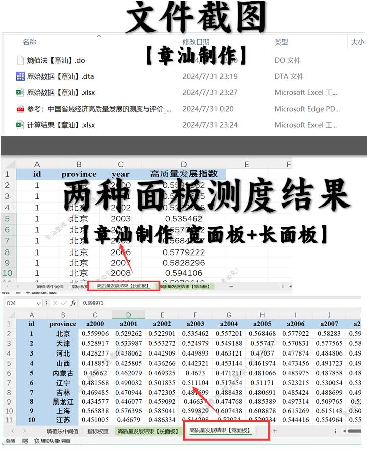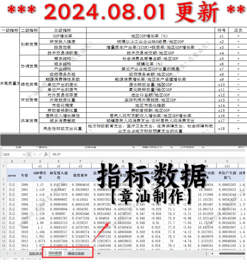 重磅更新!【章汕】制作“省级经济高质量发展指标体系测度 含代码”,市面上有这个版本的数据,但其内容非常不全面,个别指标有误,没有stata和代码,即使有代码小白也很容易报错;没有权重、宽面板等重要信息;最关键的是熵值法结果不理想。因此【章汕】在此基础上重新改进该份数据(您需要的所有信息,里面都有!)