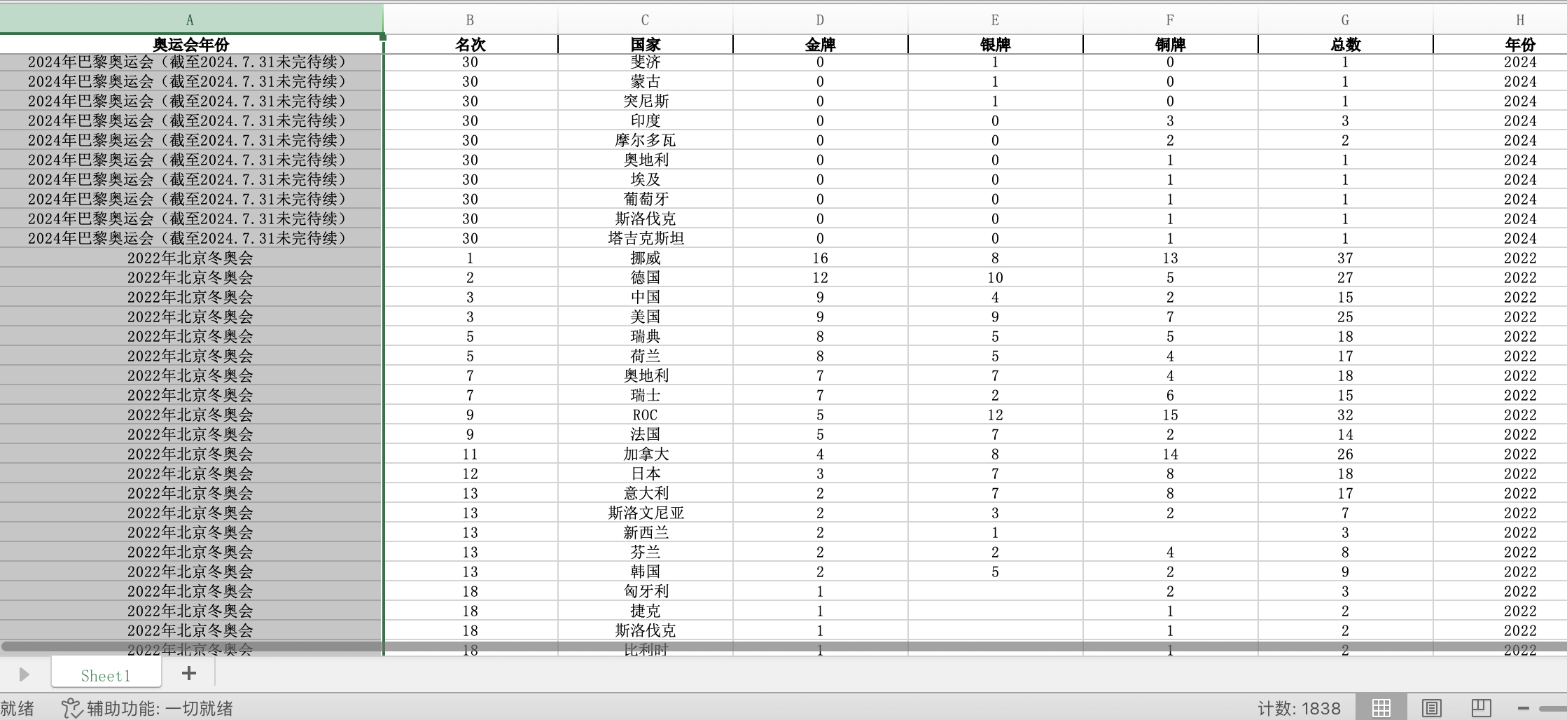 数据名称:历届奥运会冬奥会奖牌数据各国名次金牌银牌铜牌数量